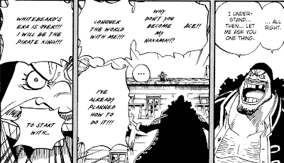 , the duel between Ace and Blackbeard begins. Blackbeard's Devil Fruit, Yami Yami no Mi is introduced. The origins of where he obtained this fruit is also shown.